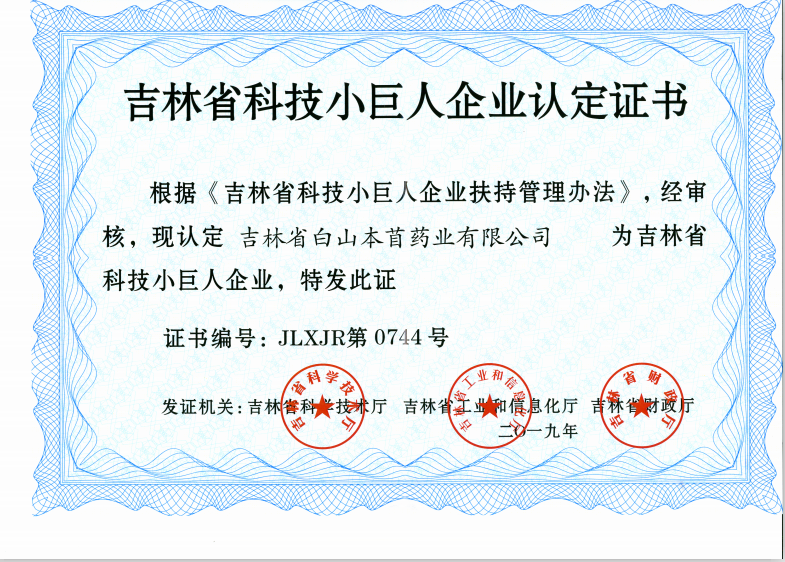 吉林省科技小巨人企業認定證書